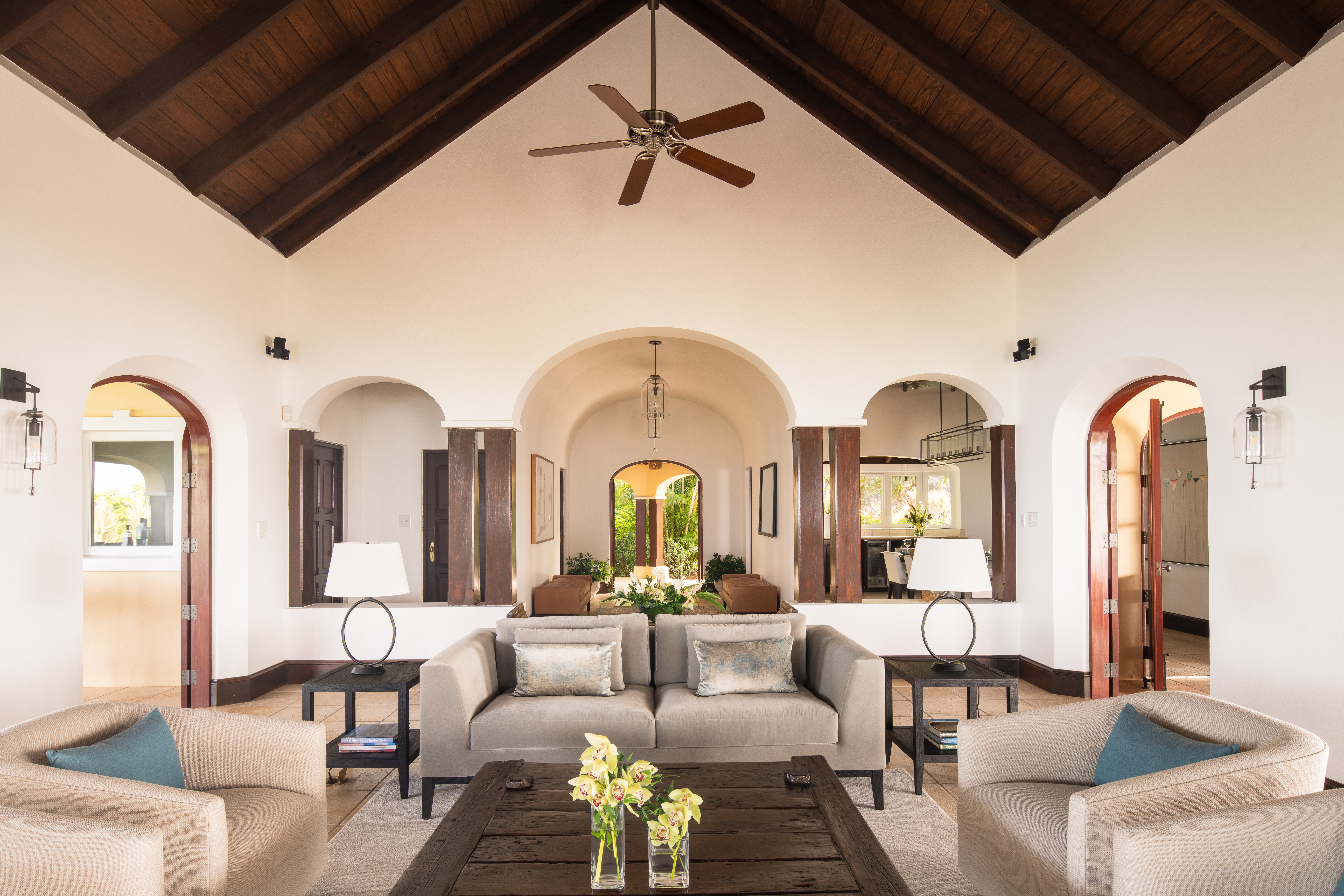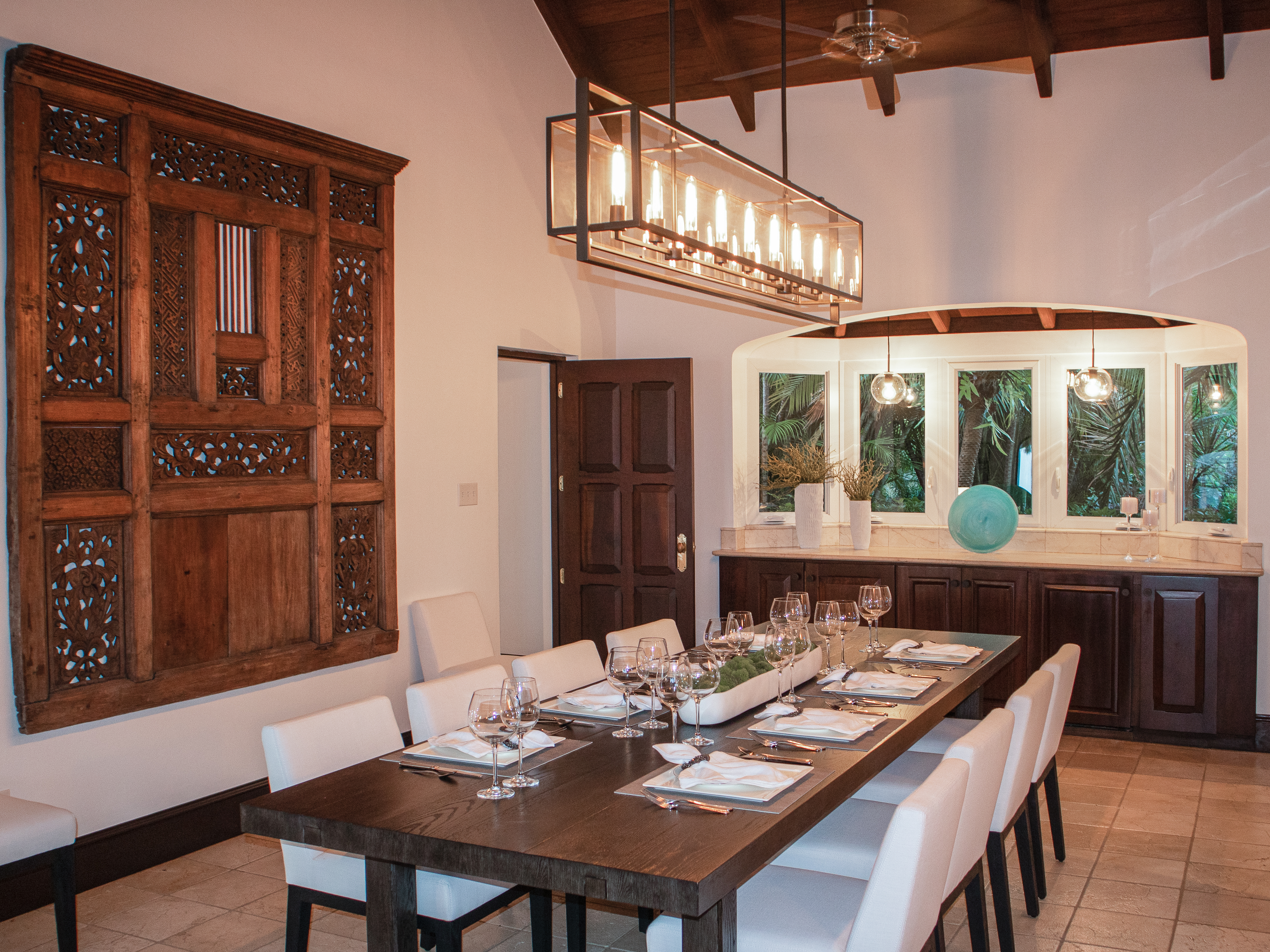 From the moment you arrive, the atmosphere is intentionally serene. Neutral color palettes set the tone, allowing the natural beauty outside to take center stage. Inside, carefully curated artwork by internationally recognized artists complements the views, while hanging lanterns crafted by local artisans and island photography ground the experience firmly in the Caribbean. Fresh floral arrangements—featuring blooms and foliage from the estate’s own gardens—add a finishing touch that feels both luxurious and personal.