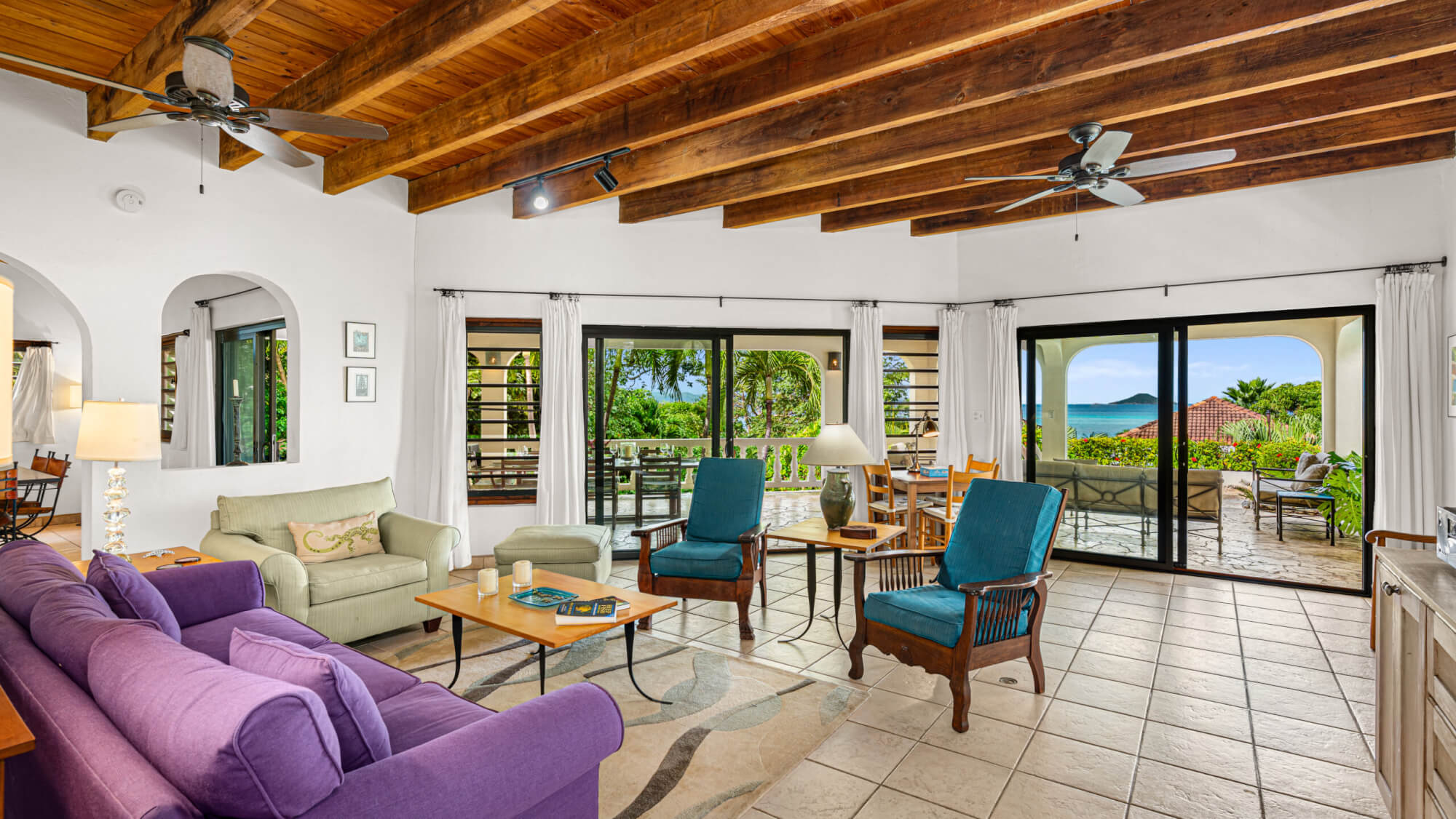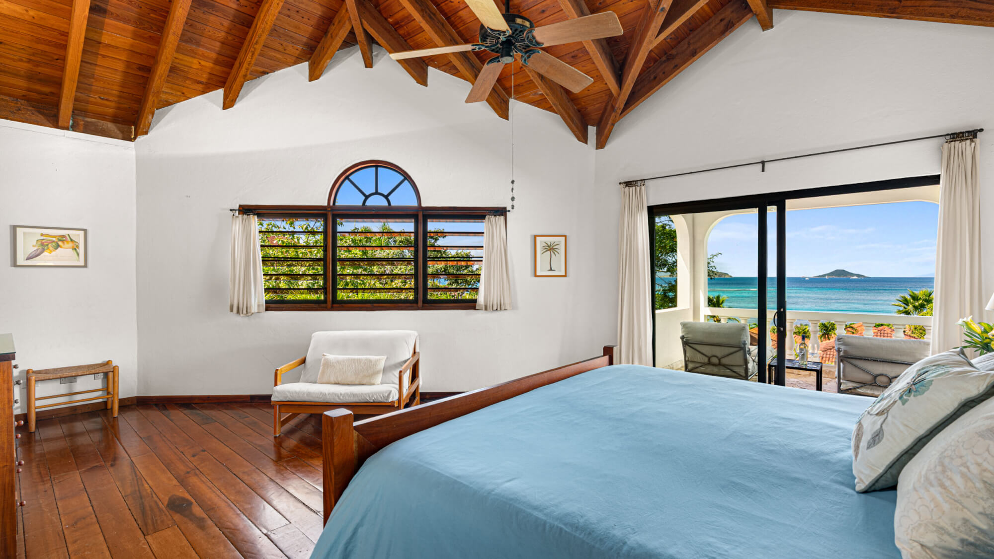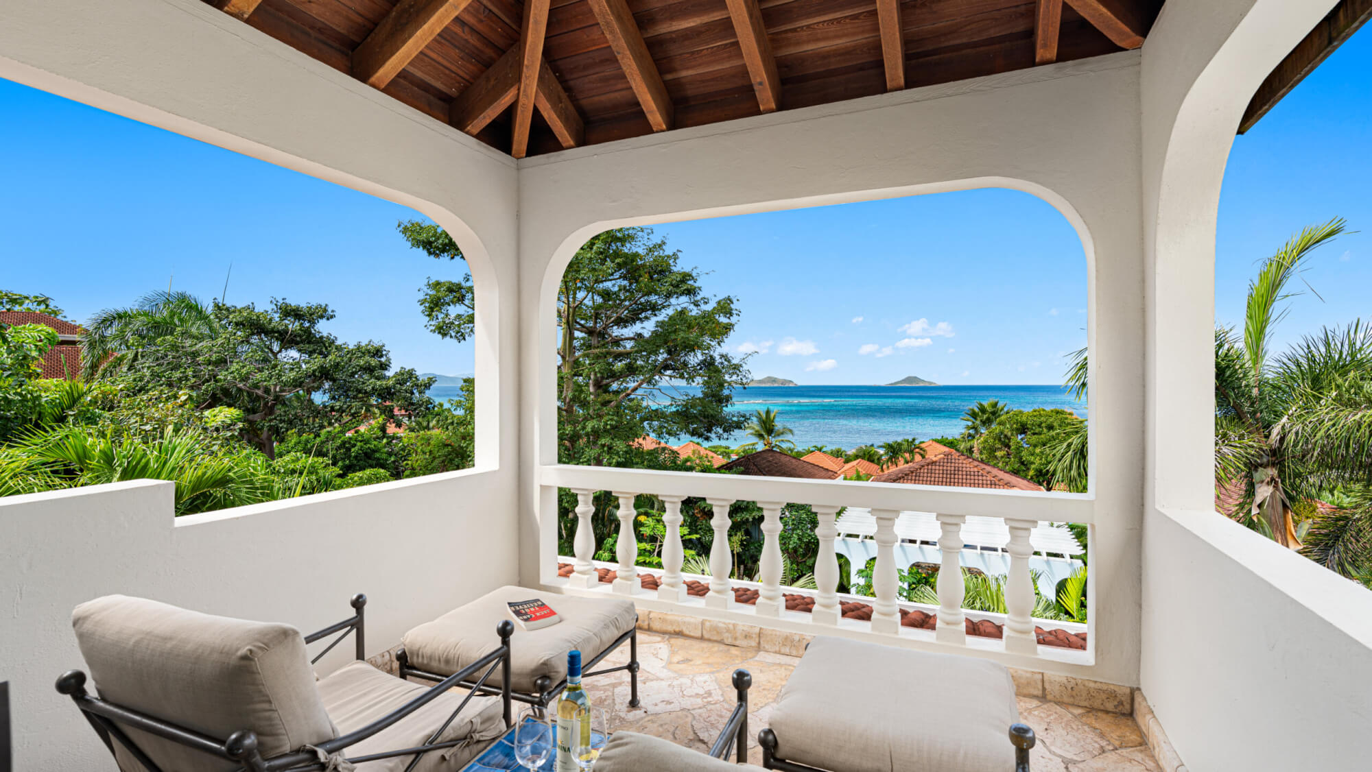 - 2nd Floor: Queen bed, en suite bath with outdoor shower, and covered veranda offering sunset views over Mahoe Bay and Seal Island.