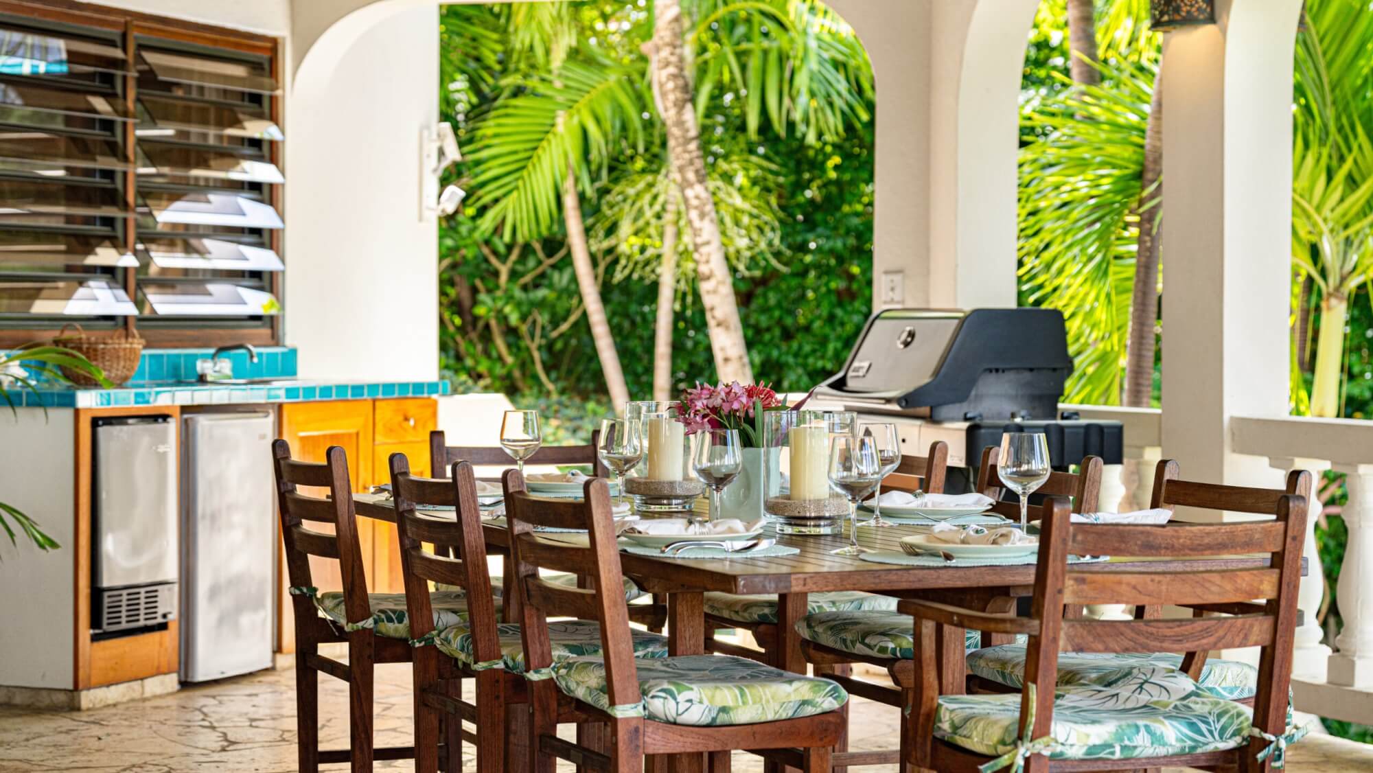 The dining area includes a custom-made table that comfortably seats eight people, offering a sophisticated setting for indoor dining or an alternative to alfresco meals on the veranda.