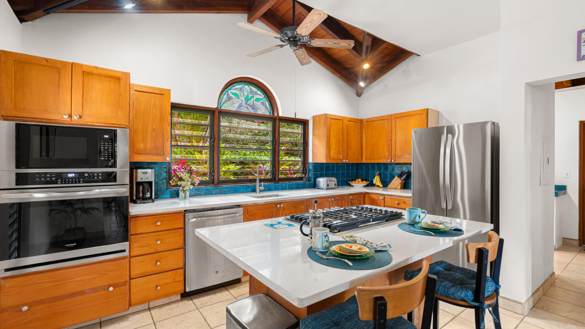 - Stained-glass arched window, hand-crafted by a local artist, adds a beautiful touch to the dining area.